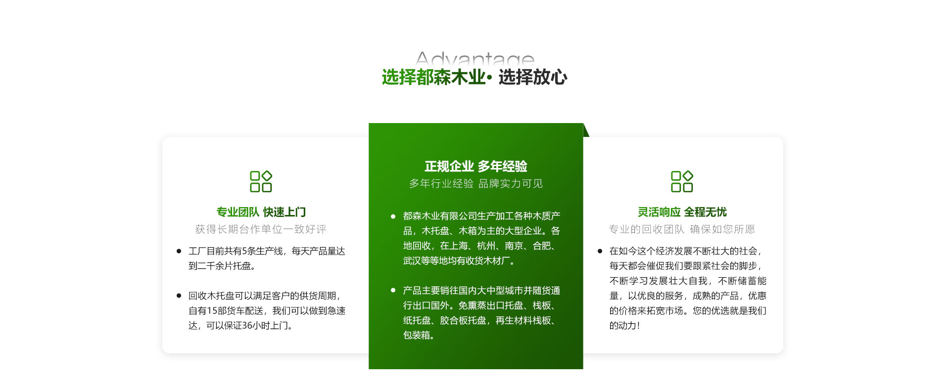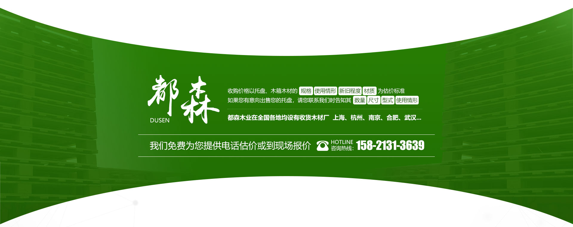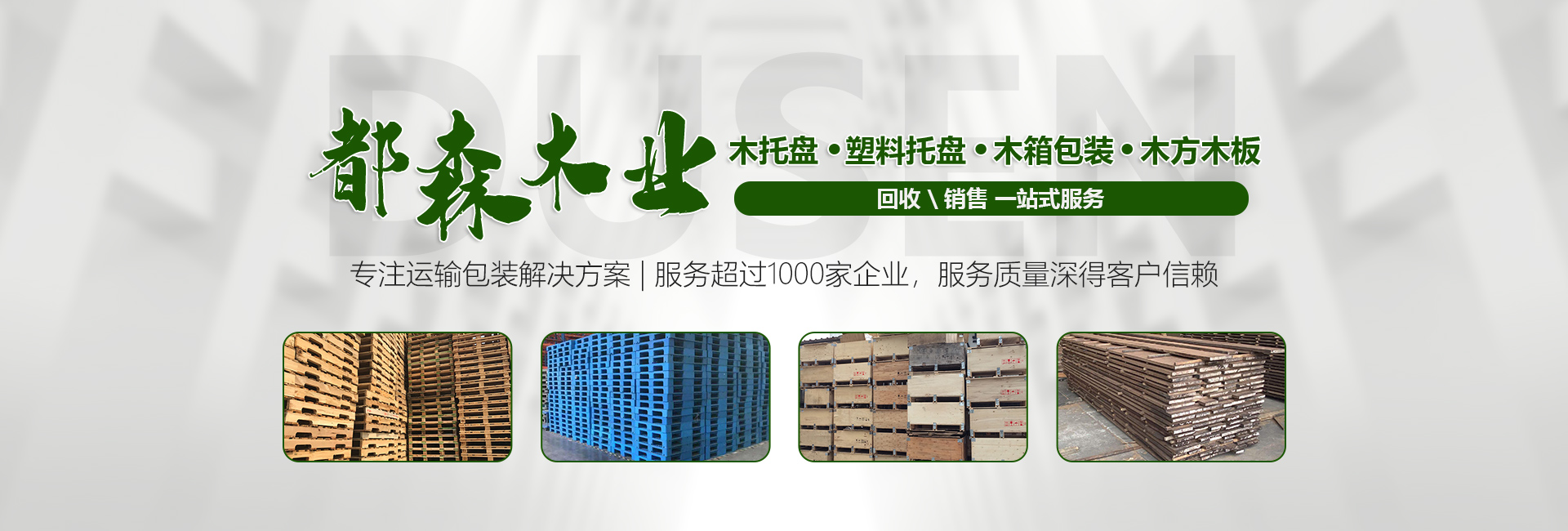 都森木業有限公司是一家以回收木托盤、木材,生產加工各種木質產品,木托盤、木箱為主的大型企業。自建公司以來,我公司根據市場經濟的發展趨勢,在經濟逐步前進的前提下發展壯大自己,不斷引入先進的生產設備,科學的管理理念,過硬的生產技術和嚴密的質量管理體系。加工:公司下轄木材加工廠,組裝廠,并備有大型標準烘房,多功能平板刨,壓刨,挖槽,機械設備等。產品主要銷往國內大中型城市并隨貨通行出口國外。免熏蒸出口托盤、棧板、紙托盤、膠合板托盤,再生材料棧板、包裝箱。工廠目前共有5條生產線,每天產品量達到二千余片托盤。可以滿足客戶的供貨周期,自有10部貨車配送,我們可以做到急速達。回收:公司建立以來長期以現金收購各種規格木托盤,塑料托盤,棧板,復合托盤,木箱,收購價格以托盤木箱的規格、使用情形、新舊程度、材質為估價標準。可上面看貨。我們將以豐富的知識,提供“量身定做”的方案來服務和滿足每一用戶不同的需求,現金... [查看更多]